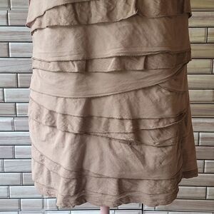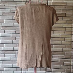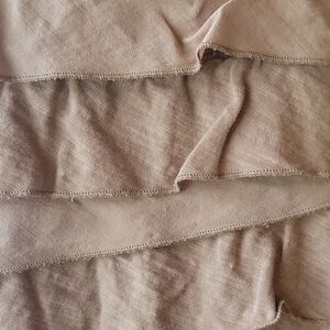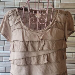 100% cotton soft stretchy fabric in a taupe color. Great for summertime wear. Short sleeved round neckline and a criss cross ruffle in front.