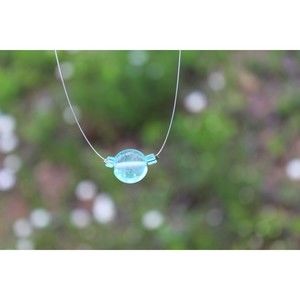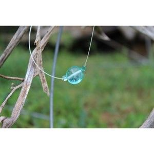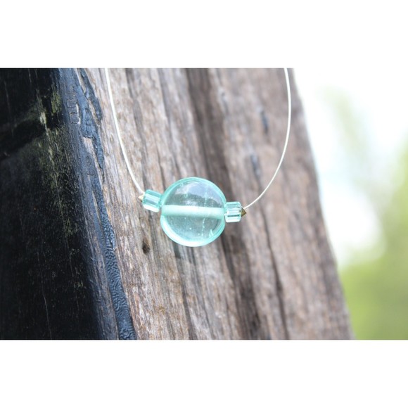 Anna features a dime sized aqua stained glass bead that is bordered by two triangle shaped glass beads of the same color. All is strung on a thin silver wire. Necklaces are approximately 16 inches in length, however, different sizes can be accommodated.