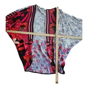 Brighten up your look with this bold and breezy Anna & Ava open front kimono cardigan. Crafted from 100% soft viscose, this lightweight layering piece features a vibrant patchwork of florals, stripes, and abstract prints in red, pink, black, blue, and white tones. The draped open front and ruched dolman sleeves add effortless style, making it perfect for casual days, travel, or warm-weather outfits. One size fits most for a relaxed, easy fit.