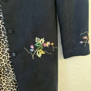 This collared car coat in black micro suede with all over floral embroidery is the perfect topper for an evening occasion. It features lace trim around the waistline, a concealed full button front and a pop of interest in its leopard print lining. It hits at mid-length/ just below the knee depending on your height.