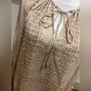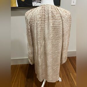 Anna Cate Audrey light tan and white print dress, tie neck, fully lined, excellent condition size small