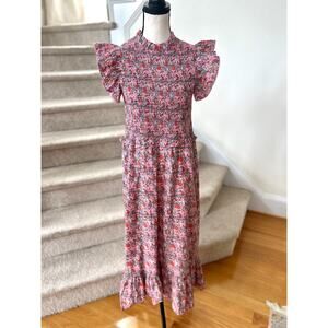 Anna Cate Pink Floral Block Print Shirred Ruffle Sleeve Midi Dress