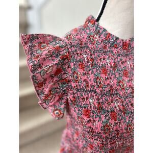 Excellent condition. Pink with red and green floral block print pattern. Ruffle cap sleeve, shirred elastic bodice, drop waist midi skirt with ruffle hem.