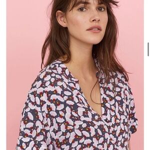 Charming slip-on dress with a feminine V-neck and a beautiful floral pattern, making it a versatile addition to your fall wardrobe. Designed by London-based wallpaper designer Anna Glover in collaboration with H&M, this piece features her signature whimsical botanical prints with a modern twist. Good used condition with no holes, rips, or stains. Perfect as a dress, tunic, or layered cover-up.