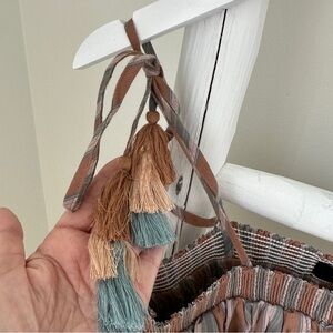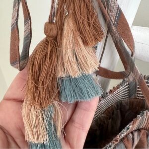 Chic striped top with tassel details. Features brown and blue tones. Perfect for casual outings and festivals.