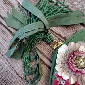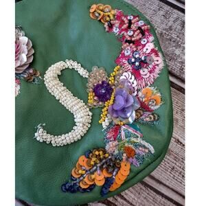 Anna Harlow Russo x Anthropologie | Green Floral Beaded Monogram “S” Leather Pouch // Cosmetic Bag // Accessory Bag