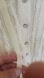 Anna Huling crafted this delicate, Gothic, ruffled blouse in a slightly deconstructed style she associated with the "Rodarte" line, which she much admired. An extremely delicate, "distressed" garment, the button down blouse features three ruffles on either side of the placket, interspersed with two slightly darker shaded cream ribbons, affixed halfway down, and then cut free of the sewn fetters to flow (see video). "Spiderweb" strands of loose fabric slightly film the sheer piece, which has six pearl snap buttons on the placket and two more on each sleeve cuff. It runs "26 from the back collar to hem. with a "14.5 inseam, "23 sleeve. A gorgeous, one-of-a-kind artwork.
