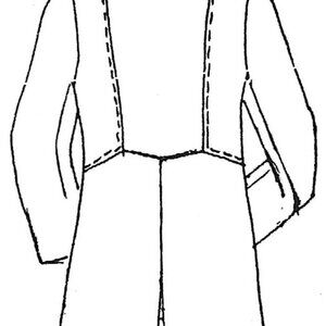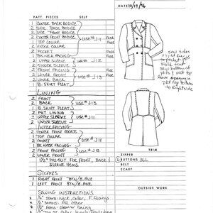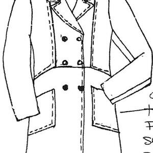 Anna Huling wore this coat on occasion. it is a charcoal-colored, double-breasted, fitted, knee-length coat with a silver silk lining. It has six buttons on the breast and two waist-level patch pockets cut at an angle. Three-button detail at sleeve cuffs. Kick-pleated in the back. The fabric is stretch wool: 63% polyester, 34% wool, 3% lycra. The sleeve is "24 in length. Garment runs "39 from back collar to hem. Inseam "37, pockets "8 x "6. Lapel, "4.5. Made in U.S.A. Good condition.