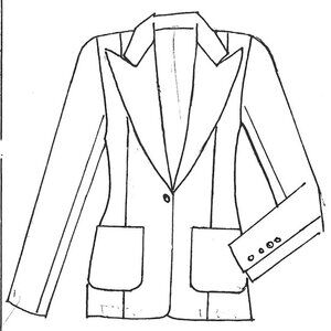 Anna Huling - sturdily constructed gray wool blazer with silver silk lining. Single-button enclosure, two-button sleeve cuff detail, two-patch pockets at the waist ("6.5×"6.5). Five-inch lapel, "29 from back collar to hem, "31-inch inseam, and "23 Sleeve-length. Kick-pleated back. It has one flaw, it was a sample and the button has to be sewed on a little lower to me meet the eyelet.