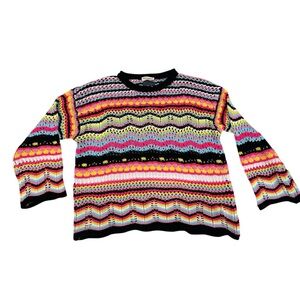 Vibrant knit sweater with multicolor stripes. Perfect for a bold look.