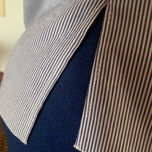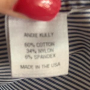 This navy & white striped sleeveless blouse has navy fabric appliquéd on front. Has hi lo hem and has key hole and button closure. Cotton/nylon & spandex blend. Trim around neck & sleeves and at shoulders. Only wore once. Excellent condition. Size XS