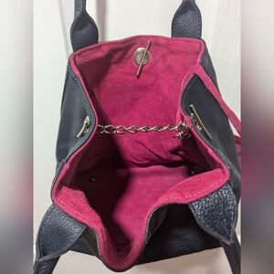 Lining is suede in fuchsia & features a detachable suede zippered pouch (5.5"x3.5"),