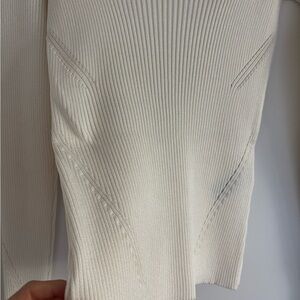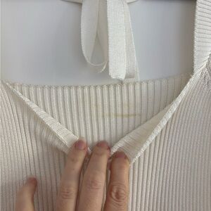 Elegant ribbed sweater. Features a square neckline. Long sleeves with a tie back detail.