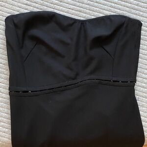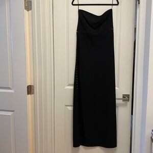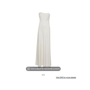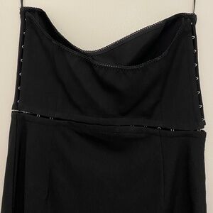 Beautiful, minimal, elegant, and never worn ! This amazing garment features an adjustable side slit that you can modify using tiny metal hooks that run up the side of the dress and also connect the top to the skirt. Pretty lace detailing on the hem and neckline.
