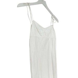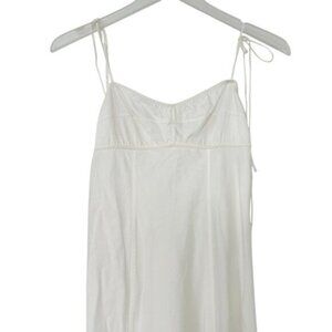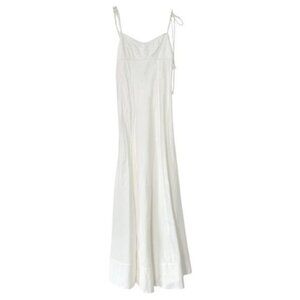 Libertine dress by Anna October. White. 100% cotton poplin fabric. Open back with adjustable ties. Bustier style stitching on bust. Thigh high slit. Loop trim detailing. Adjustable shoulder straps. Unlined. Hidden zipper on side. No known flaws -- in excellent condition!