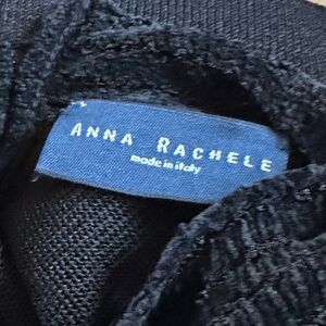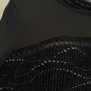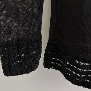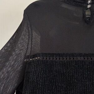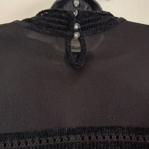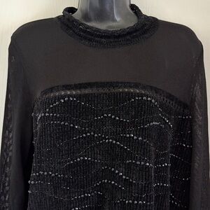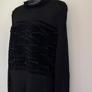 Anna Rachele vintage black mesh and velvet straight tunic in size large. High neck, button and loop back closure with keyhole, long sleeves. Mid chest is woven with black bead front, opaque. The mesh yoke, sleeves and bottom are transparent. Chest neasures 20” across, 30” length.
