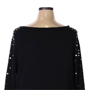 Chic and cozy Anna Scholz black sweater dress in US size 22 (UK 26). Features a flattering scoop neckline, long sleeves, and shimmering sequin embellishments along the sleeves and shoulders. Crafted from a stretchy knit fabric for a comfortable yet stylish fit. Perfect for cocktails, dinner outings, or holiday events.