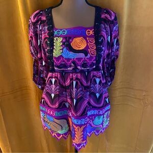 Stunningly beautiful semi-sheer colorful silk top with gorgeous embroidery of animals, flowers, abstract symbols.