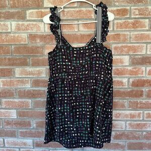 Women’s size 8 Anna Sui x Anthropologie mini dress. Silk blend material, black with small all over pattern. Ties at the waist. Great condition!