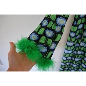 Gently pre owned. Sleeve opening is slightly puckered bc of feather trim