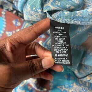 Anna Sui Blue and Black Boho Pattern Bell Sleeve Tunic Top Size 6. This tunic top is a lightweight top with a slightly thicker neckline fabric in black with iridescent flower bursts allover. The rest of the top is a blue and brown boho printed with bell sleeves in a flowy fabric. Pair with some low rise flared jeans and a cross body knitted bag.