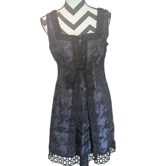 Step into a world of sophisticated edge with this captivating dress! This unique piece, likely by Anna Sui, size 11, features a striking black base with a subtle purple shimmer and a textural houndstooth-like pattern throughout. The design is elevated with an elegant black bow detail at the waist and intricate cut-out trim along the square neckline and hem. Made from a blend of 57% Polyester, 41% Viscose, and 2% other fiber for the shell, with a 100% Polyester lining, this dress offers both structure and a touch of sparkle. Perfect for a night out, a special event, or making a bold fashion statement, you'll feel absolutely empowered and unique. Imagine the admiring glances as you effortlessly command attention in this distinctive garment. It's more than just a dress; it's a statement of individuality, a blend of classic and modern, and an invitation to shine.
