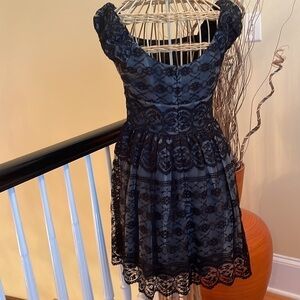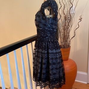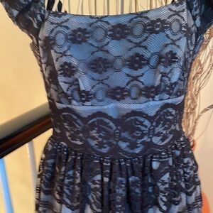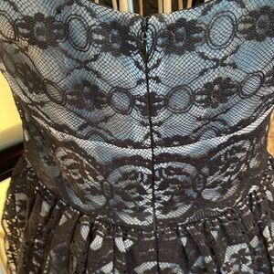 Has a hidden zipper in back it’s lace dress. White under the lace and it has a black slip