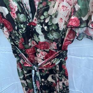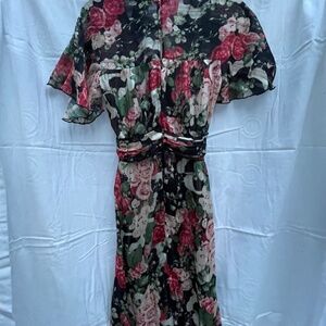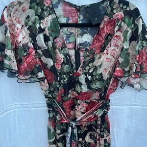 Anna Sui floral dress size 2 whimsical floral feminine flutter sleeve. Figure flattering with the deep V-neck and flutter trumpet style sleeves.
