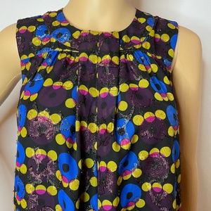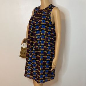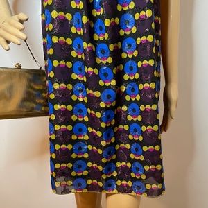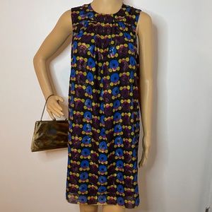 Anna Sui for target 10th anniversary collection, mod abstract graphic 60’s style print shift dress! This dress has a top sheer layer of a very mod pattern with brown, red, blue, yellow,garnet circular print with golden garnet metallic detailing. It’s a high crew neckline in the front with two gunmetal small buttons in the back with a 1” slit at the top. There’s pleating down the front for a very flowing shift dress. It’s sleeveless and has a black layering underneath. Glam by a classic designer!