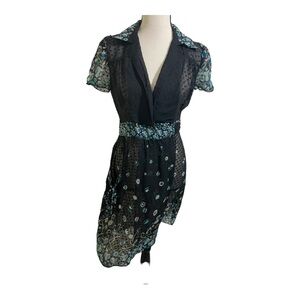 Anna Sui womens silk dress wrap sheer Swiss dot pattern. Pocket front. Black floral. Size 2.
