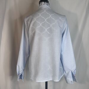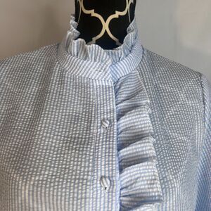 Anna-Kaci Blue White Striped Classic Ruffle Trim Button Front Blouse Size MD