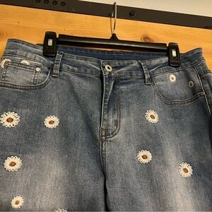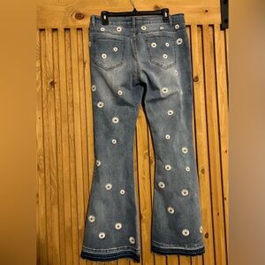 These blue flare jeans feature a playful retro-inspired floral pattern, adding a touch of vintage charm to your look. The wide-leg silhouette offers a classic bell-bottom style, perfect for making a statement. Crafted from medium wash denim, they provide a comfortable fit with a hint of natural distressing. Waist 17”, length 32”, NWT