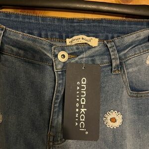 Anna-Kaci, California Denim Blue Flare Jeans with Retro Floral Design, NWT