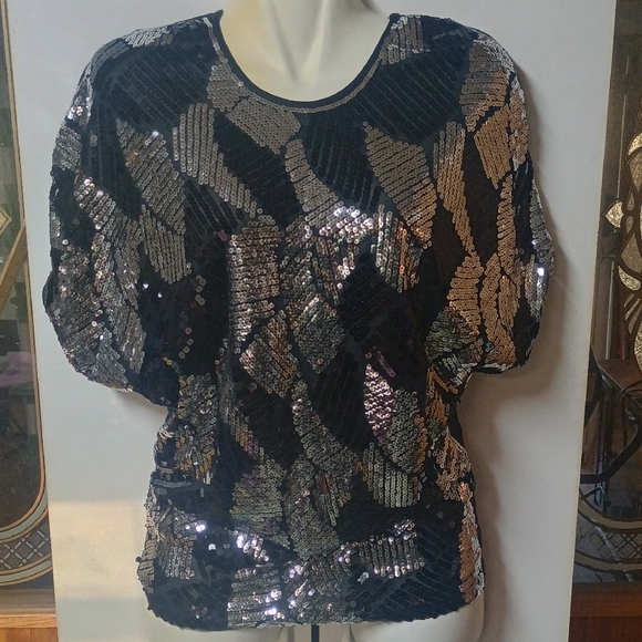 sheer mesh full of black and silver sequins, over a stretch poly base