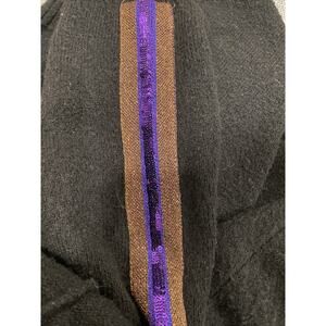 Elevate your style with this stunning AnnaRita N knit couture sweater. The black wool blend fabric is accented with gold metallic ribbon and purple sequin details on the sleeves, adding a touch of glamour to your wardrobe. The round neckline and long sleeves make it perfect for cooler weather, while the pullover style adds comfort and ease of wear. This sweater is a must-have for any fashion-forward woman who wants to make a statement.