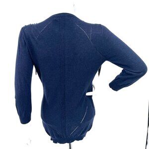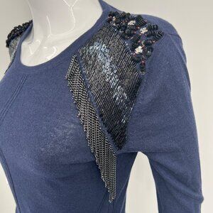 AnnaRita N Knit Couture Blue Pullover Sweater with Beaded Shoulders Chain Fringe