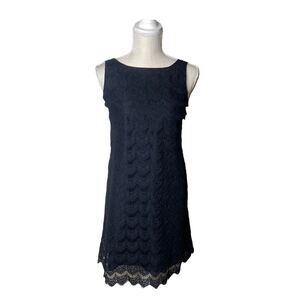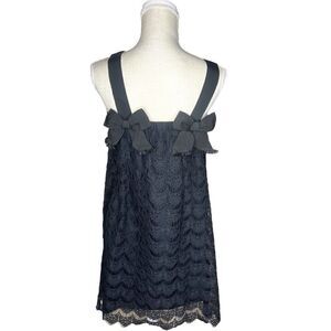 Anna Sui Black Lace Dress with Bow Detailing. Features gorgeous delicate black lace over black lining. Shift dress style. Thick black shoulder straps (non-adjustable) with sweet bow details for a feminine touch. Bows have raw hem that gives a slight edge to the overall look. Side zipper. Exterior is napkin with acetate lining. Tulle lining. Dry clean. Measurements in pictures.