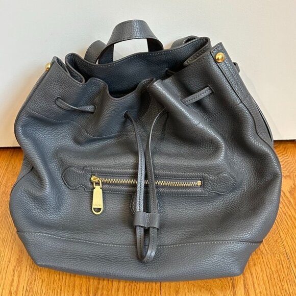 Spacious leather backpack featuring clever drawstring shoulder straps to keep your valuables safe. Contains a zippered pochette to store your wallet & phone. Made from the highest quality Italian pebble Leather.