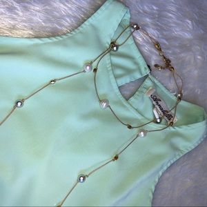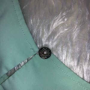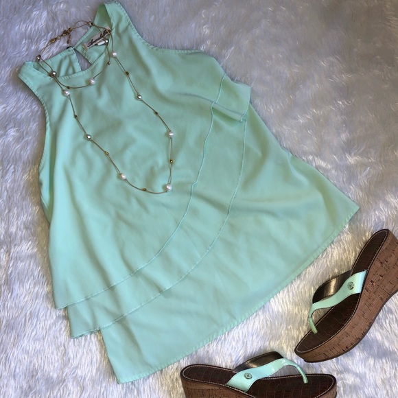 Beautiful mint green. Tiered ruffles down front. Scoop neck. Plain back w/ keyhole Button. Flower button w/ rhinestone. Very soft & silky feel to this top. EUC Like New! 100% Polyester.