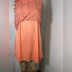Annabella,S, sleeveless, coral high collar button loop closure lace overlay contrast liner mini.