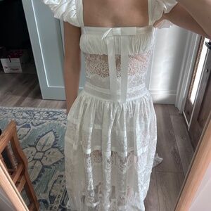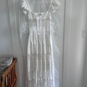 Elegant white lace maxi dress. Features delicate lace details and a train. Perfect for getting ready on your wedding day! Worn once, like new condition, and freshly dry cleaned.