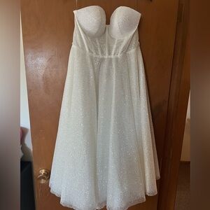 Shine on your special day with the Annabelle wedding dress. This elegant white dress features a sparkling design perfect for a memorable occasion.