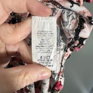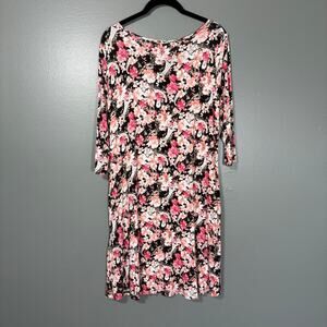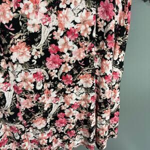 Women's cottagecore 90's style grunge t-shirt dress by Annabelle. This pink and black calico floral dress is knee length with a scoop neck and pockets. It is a rayon spandex blend.