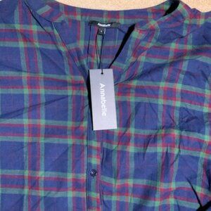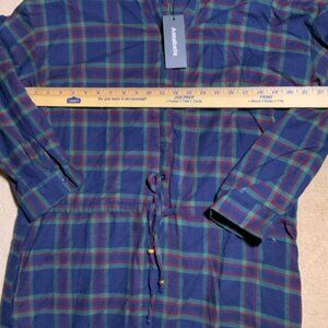 Introducing the Annabelle Women's Size Large Tunic, a splendid fusion of comfort and style for your casual wardrobe. This tasteful tunic features a classic blue flannel pattern, accented with vibrant lines of green and red to create a captivating plaid design that exudes a rustic charm. The garment is expertly crafted from a soft and cozy material, promising not only durability but also a gentle touch against the skin. Its button-down front and tie detail at the waist provide a customizable fit and add a touch of elegance to the relaxed silhouette. The long sleeves come with the convenience of adjustable cuffs, allowing for versatile styling options. Whether you pair it with your favorite jeans for a casual outing or leggings for a comfortable day in, this tunic is sure to become a cherished addition to your collection.
