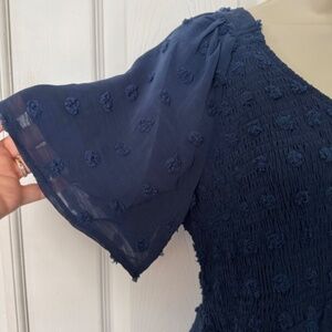Super cute! Annabouti baby doll style short dress with a high-waisted, smocked bodice and short fluttery sleeves. V-neck. Wide 4 1/2" ruffle at bottom edge. Skirt and sleeves are fully lined. Swiss dot fabric in a 100% polyester fabric. Color is listed as navy, but it is a more of a soft navy blue.