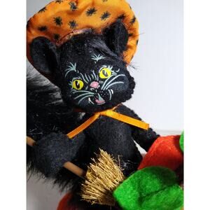 Perched atop a cheerful pumpkin base with a painted jack-o'-lantern face, the cat holds a miniature broomstick decorated with felt leaves and a pumpkin, adding to the festive Halloween theme. Made with a combination of soft fabrics and vibrant felt, this original Annalee collectible from 2018 highlights exceptional craftsmanship and attention to detail. Its vintage-style design and unique character make it a must-have for collectors and Halloween enthusiasts alike.