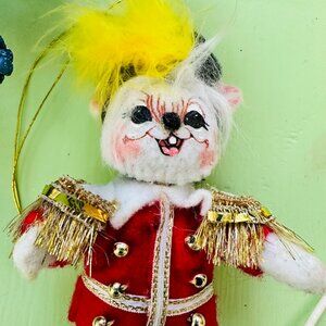 2009 Annalee Xmas ornament featuring a marching band mouse. This is a rare, hard to find ornament. The mouse is soft-bodied and approx 4" tall (counting his hat) and 2.5" wide. In good condition with some spotting to his feet and hands.
