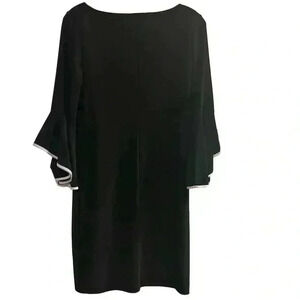 This Annalee + Hope women's dress features a boat neck and bell sleeves, offering an elegant style suitable for party or cocktail occasions. The dress is knee-length and comes in a classic black color, designed for all seasons. It is a regular size M and manufactured in the USA. The material is unspecified. The dress is pre-owned. Keywords: bell sleeve, boat neck, knee length, black dress, party dress, cocktail dress, elegant, women's fashion, USA made, all seasons, pre-owned, medium size, long sleeve, regular fit, unbranded.
