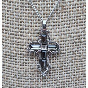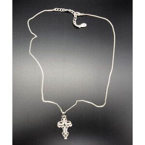 This elegant Annaleece reversible cross pendant necklace features a dainty silver tone cross with baguette crystal accents. The 18" long adjustable chain offers versatile wearing options, making it a perfect accessory for any religious occasion or everyday wear. MINT Condition for gift giving