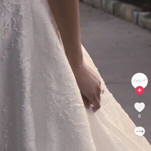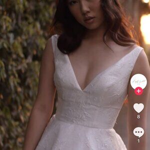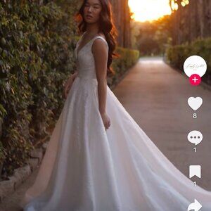 Fabric: Organza, mattelasse (I suggest googling mattelasse if it is not a style of material you are familiar with, as I know I was not before trying this on. It just pops. I had never seen any fabric like it. It is super light, flowy moves with you and it's fabric has these unique details - it's not lace, its not a printed pattern look, its not a 3D anything, its a beautiful, subtle look and so unique and special), v--neck, has a back beaded hem - It looked elegant and romantic. It's not bright-bright white, it is the day dreamer color. has pockets!!